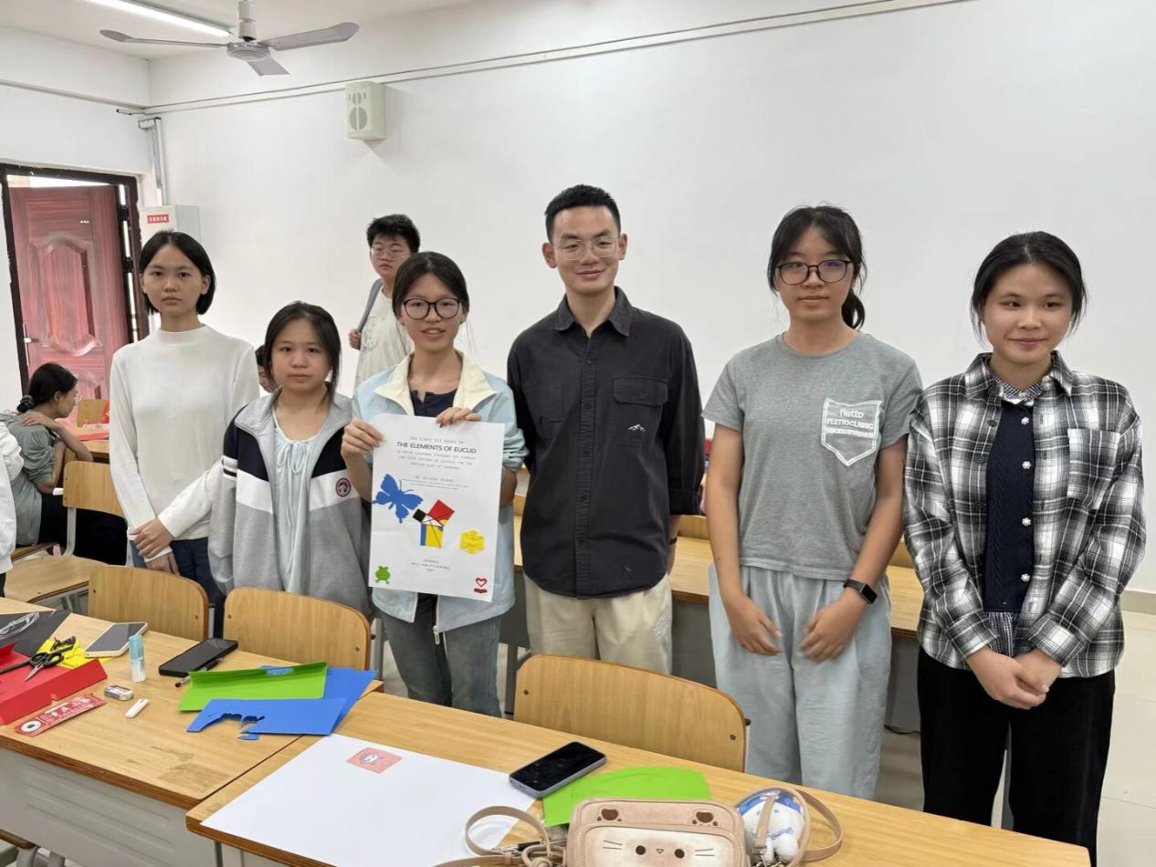 准备的设计稿分工协作。本次活动的设计稿由卢若楷老师设计提供,以“欧几里得的《几何原本》”、“斐波那契数列与黄金分割点” 等为核心主题,将抽象的数学概念转化为具象的剪纸图案。创作过程中,同学们不仅精准还原设计稿中的对称结构与比例关系,更不乏巧思创新——有的小组通过调整线条弧度优化黄金分割比例呈现,有的则在数列规律基础上增添创意元素,让每一件作品都兼具数理严谨性与艺术独特性。