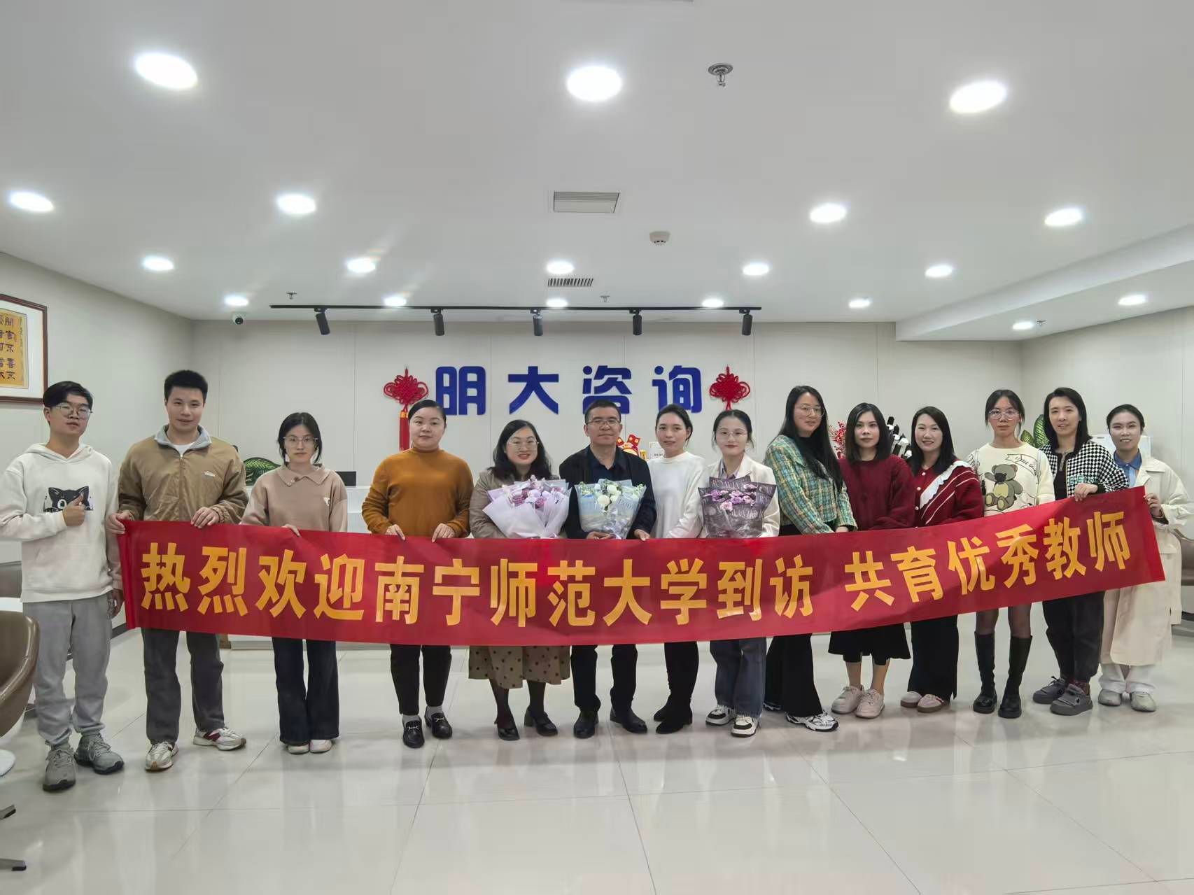 党委副书记王卫彬、团委书记梁卡霖、辅导员滕容梅带领毕业班学生代表,前往南宁明大教育开展访企拓岗活动。明大教育人力总监陆庆熊及南宁各校区教学主管热情接待,双方围绕校企合作、毕业生就业等议题展开深入交流。